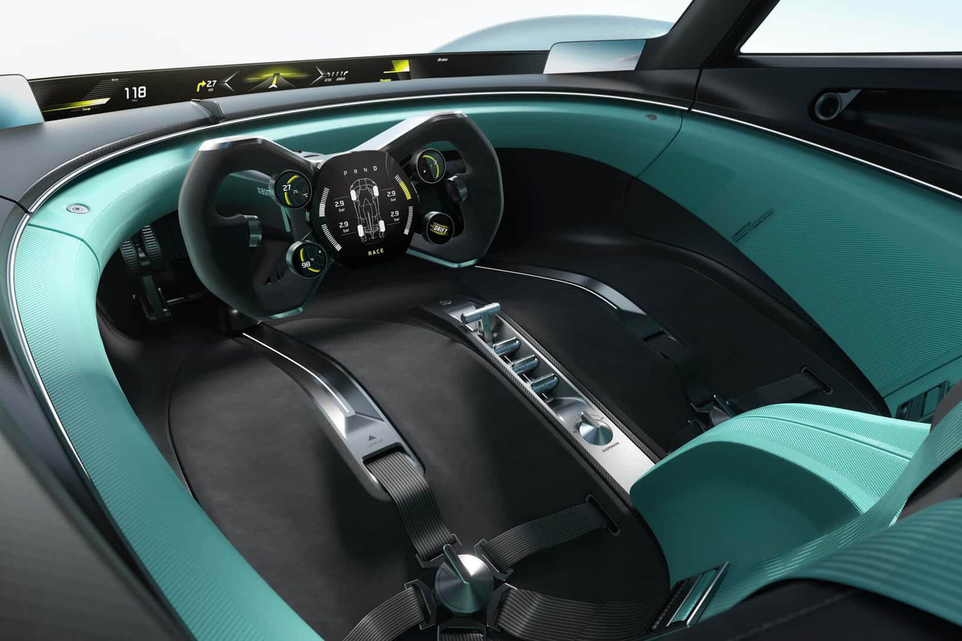 Inside, the company describes the cabin concept as a “Sofa Racer”. The dashboard, seats and door trims form a continuous loop around the driver, creating a cocoon-like feel. A slim display sits at the base of the windscreen, complemented by a screen integrated into the race-style steering wheel. Five-point harnesses and a bank of physical toggle switches between the seats add to the motorsport aesthetic.