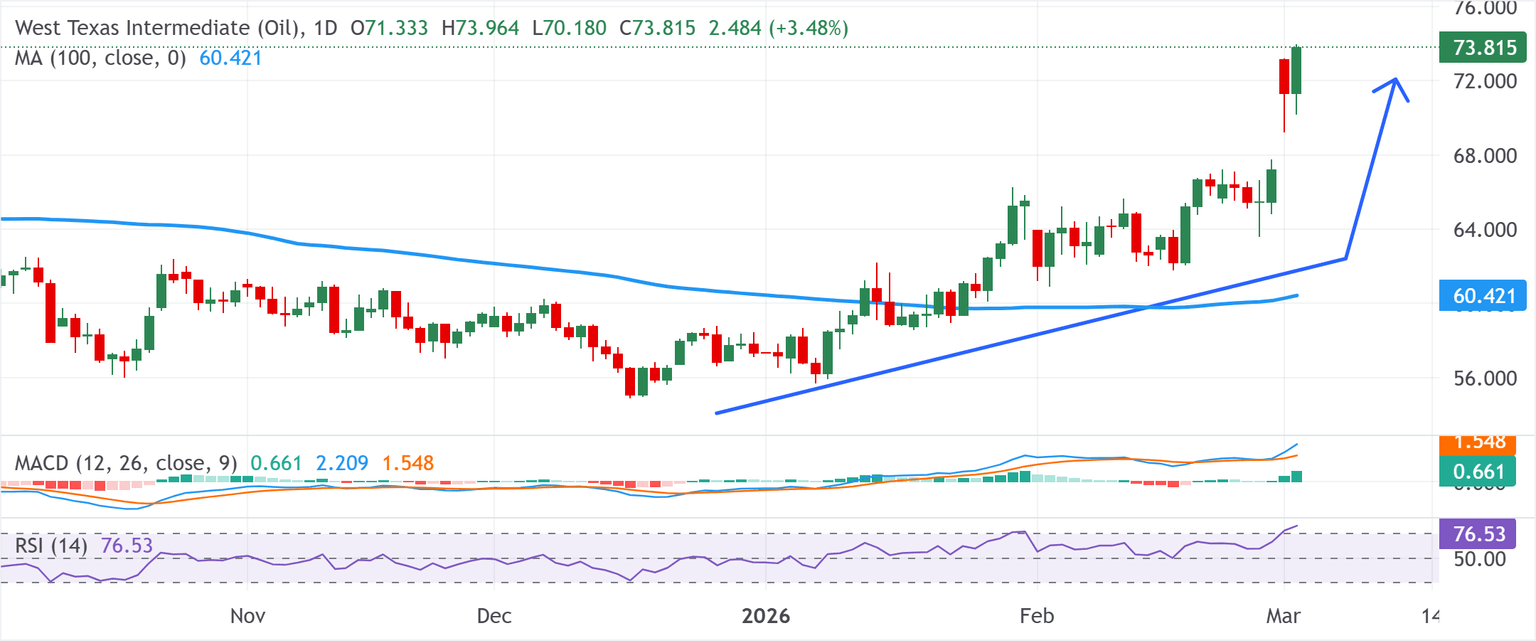 Crude Oil prices surged to the highest level since June 2025 on fears of a widening conflict and the effective closure of the Strait of Hormuz.