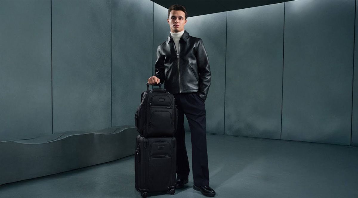 TUMI Global Brand Ambassador Lando Norris with the Alpha Brief Pack in Black and Alpha Dual Access Expandable Carry-On in Black