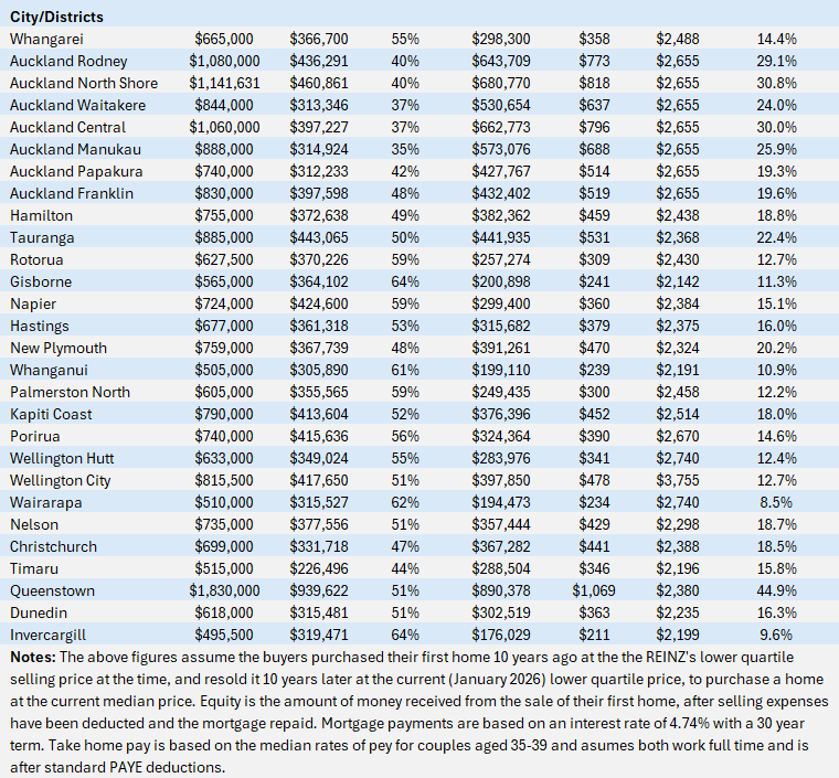 Ten years later and they are ready to move up to something a bit better, so sell their home at the REINZ’ s January 2026 lower quartile price of $580,000, up 92% on their original purchase price.
