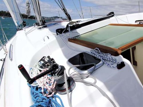 Further aft in the cockpit the primary sheet winches are mounted where you would normally expect to find spinnaker sheet winches – just in front of the wheel. The steering is light and responsive yet well balanced with just enough weather helm to let you know where things are at. The small (390 sq ft) self-tacking jib makes light work of upwind slogs and provides enough power to keep the yacht powered up in anything over about 15 knots true. Fitted as standard with outboard genoa tracks, the Hanse 400e can be fitted with an optional 140 percent genoa or gennaker. Spinnaker fittings, poles, halyards etc are not supplied. Perhaps the only criticism of the control line layout is the position of the mainsheet traveller.