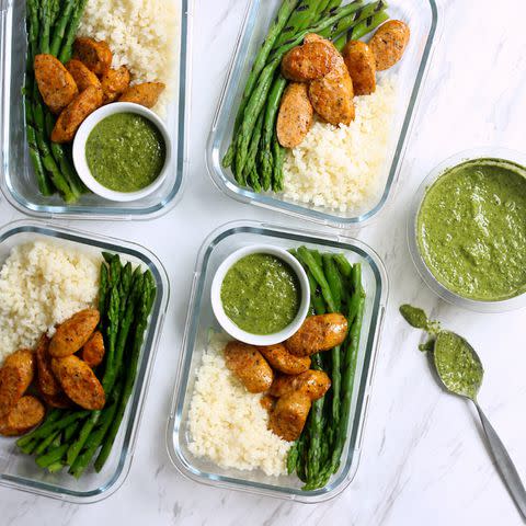 Stock the fridge with a week’s worth of lunches using a handful of ingredients from your local grocery store. To reduce carbs, we’re swapping in riced cauliflower for regular rice and adding pregrilled asparagus, which bulks up these bowls and adds fiber. At lunchtime, just reheat to steaming then top with a bit of pesto. Try Trader Joe’s for fast shortcut ingredients like these—see Tip (below) for our product recommendations.
