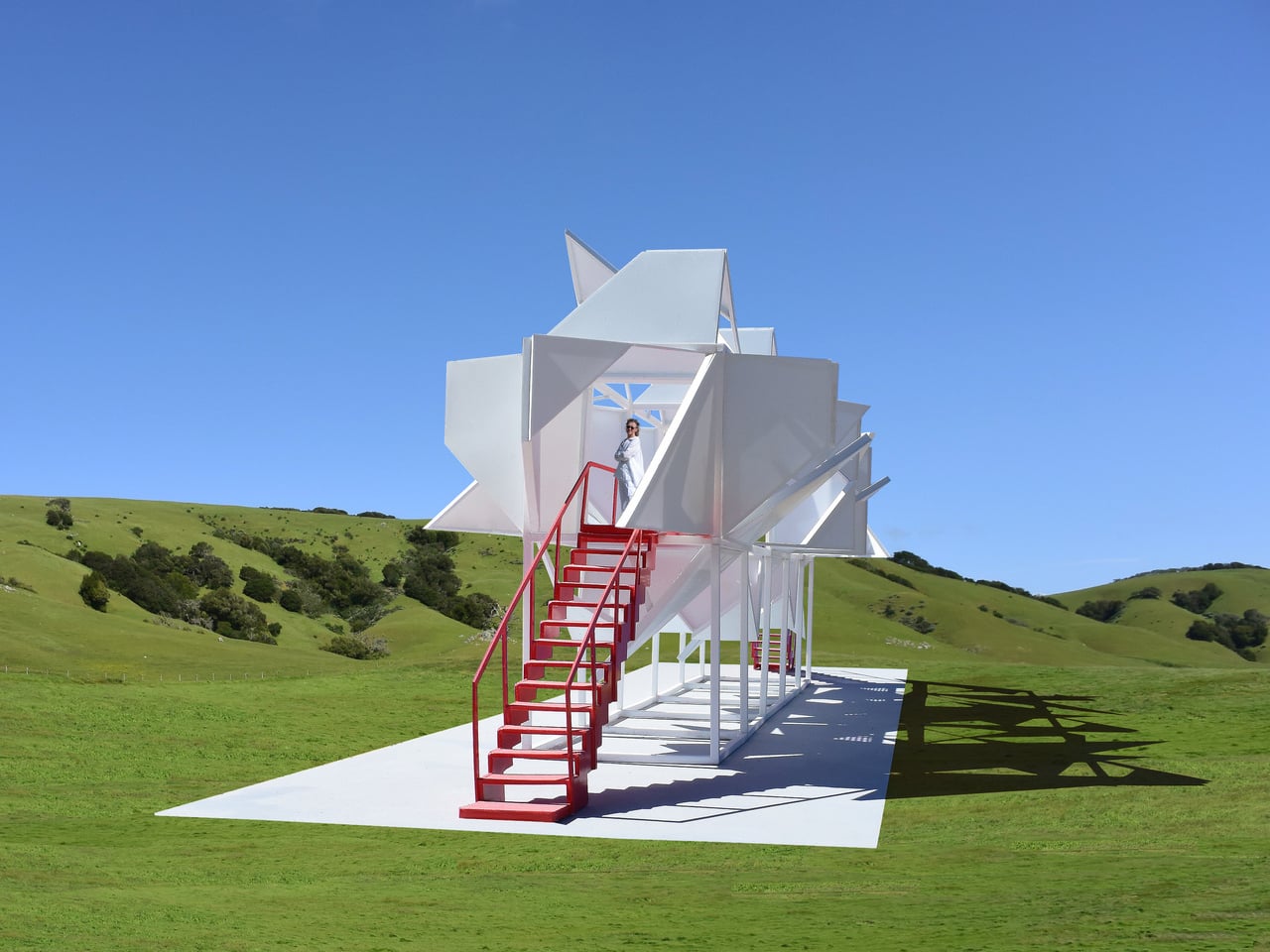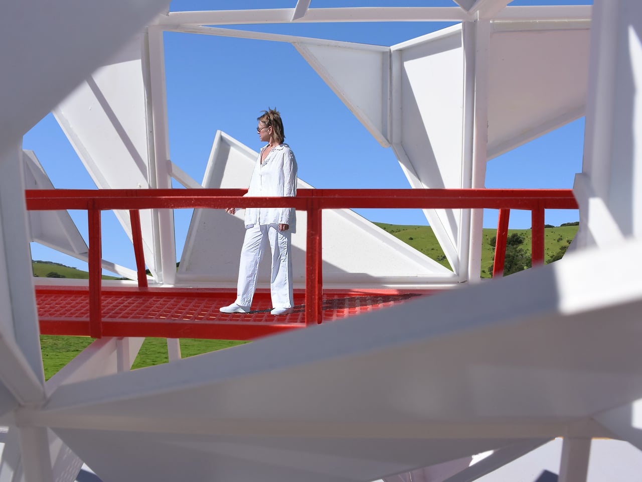 The pastoral setting, open green hills, and clear sky make the white-and-red contrast sharper still. A sculpture this geometrically dense, placed in an undisturbed landscape, is a deliberate provocation, and it earns visual authority because of it. The mesmerizing structure does make one wonder whether the interior experience, walking the catwalk surrounded by folded steel at close range, delivers the complexity it promises from a distance, or does the chaos quietly resolve once you are standing inside it?