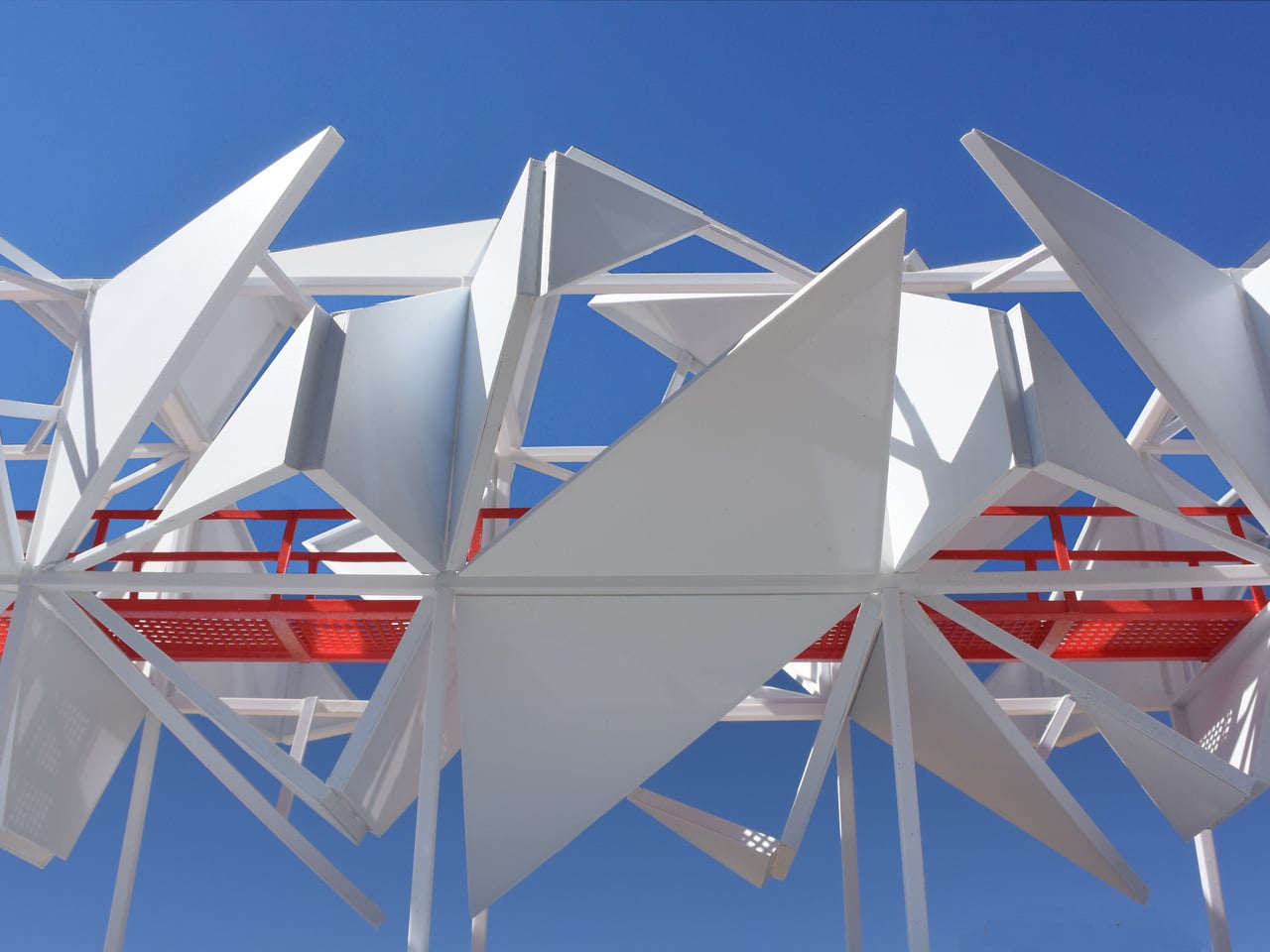 Two red staircases, one at each end of the structure, lead up to a mid-level catwalk with red perforated steel grating underfoot and tubular red railings. The red is not subtle. Against the all-white panels and columns, it functions less as a safety feature and more as a graphic element, separating the structure’s circulation path from its expressive surface. Inside, the folded panels create a partially enclosed space, with light cutting through the gaps between triangles at angles that shift as you move.