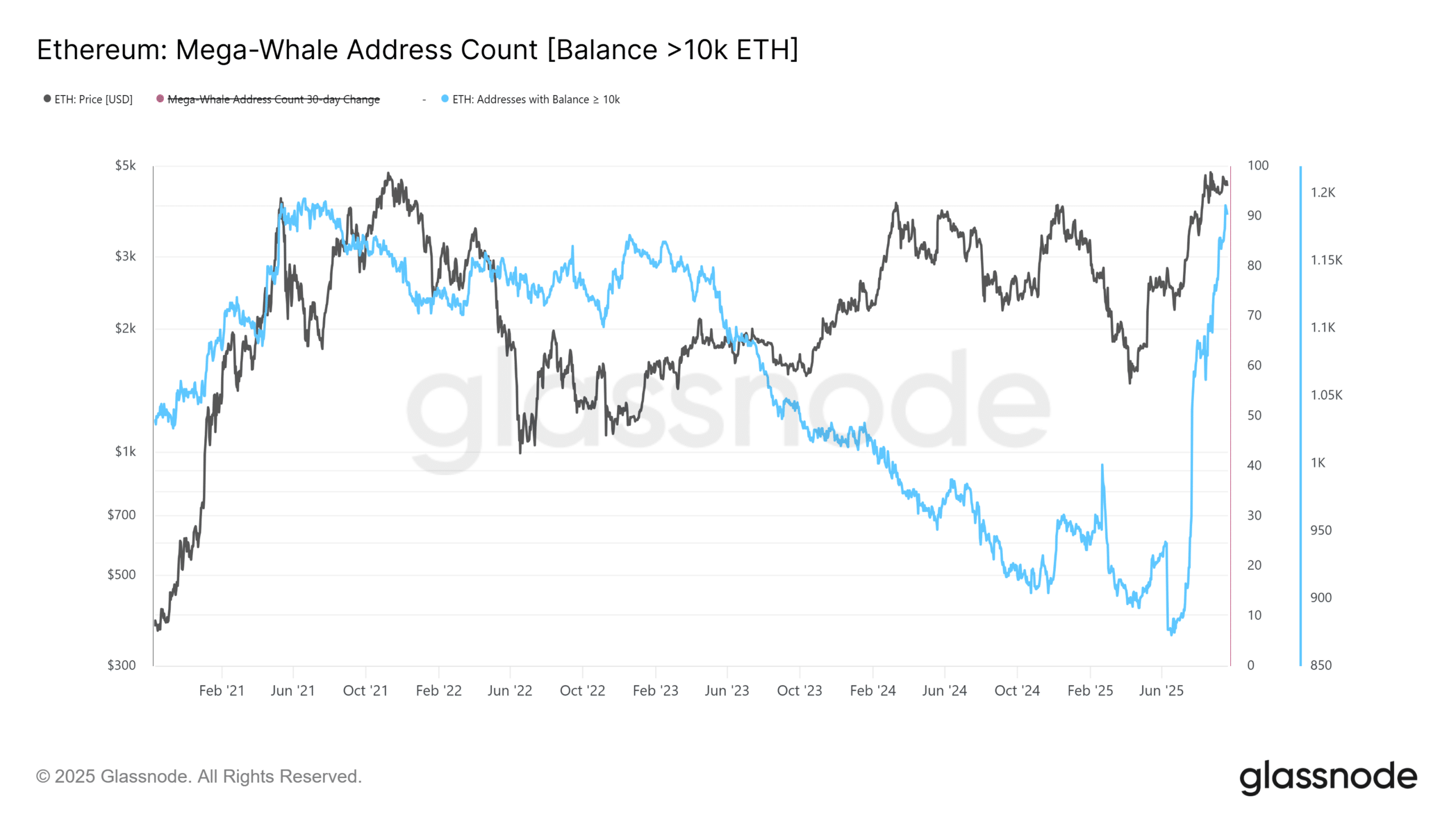 Glassnode data shows the count of “mega-whale” wallets has shot up sharply in recent weeks, reaching levels not seen since early 2021.