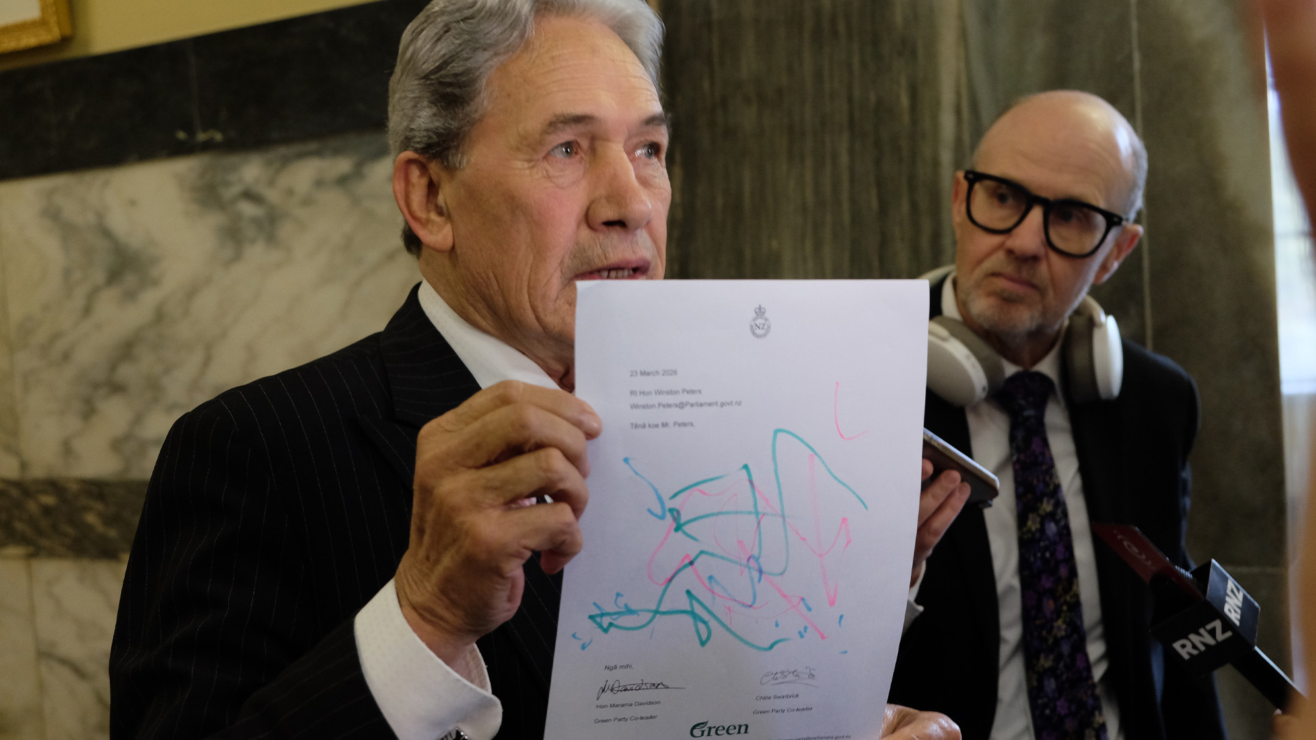Winston Peters holding up a “letter” from the Greens. Image source: Mandy Te