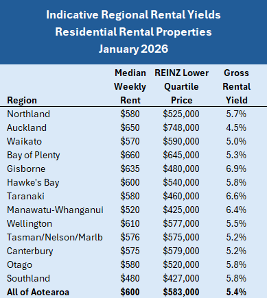 The table below shows the median rents in each region, based on bonds received by Tenancy Services, compared to the REINZ’s lower quartile selling price in each region. That enables an indicative gross rental yield to be calculated for each region around the country.