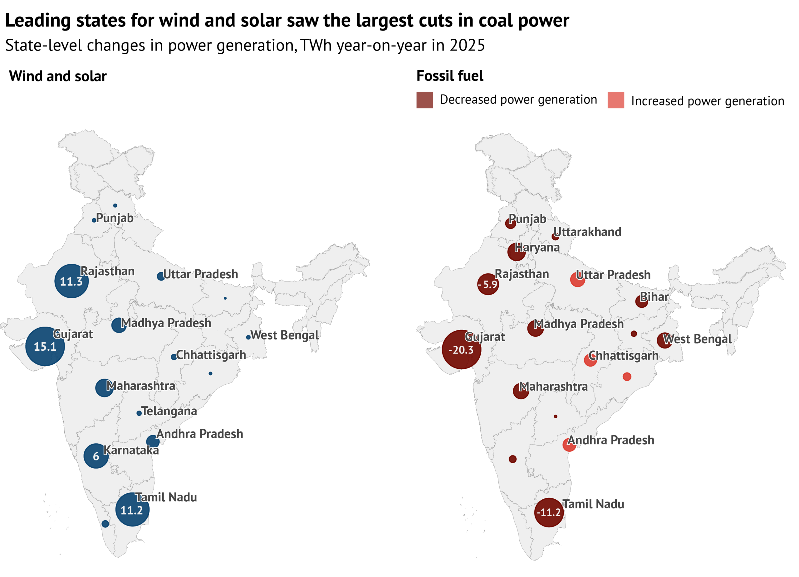 Now, power-sector emissions could be about to reach an inflection point, with clean-energy additions projected to overtake average rate of electricity demand growth in 2026, for the first time. This already happened in 2025 in Gujarat, Rajasthan and Tamil Nadu, the highly populated states leading solar and wind development.