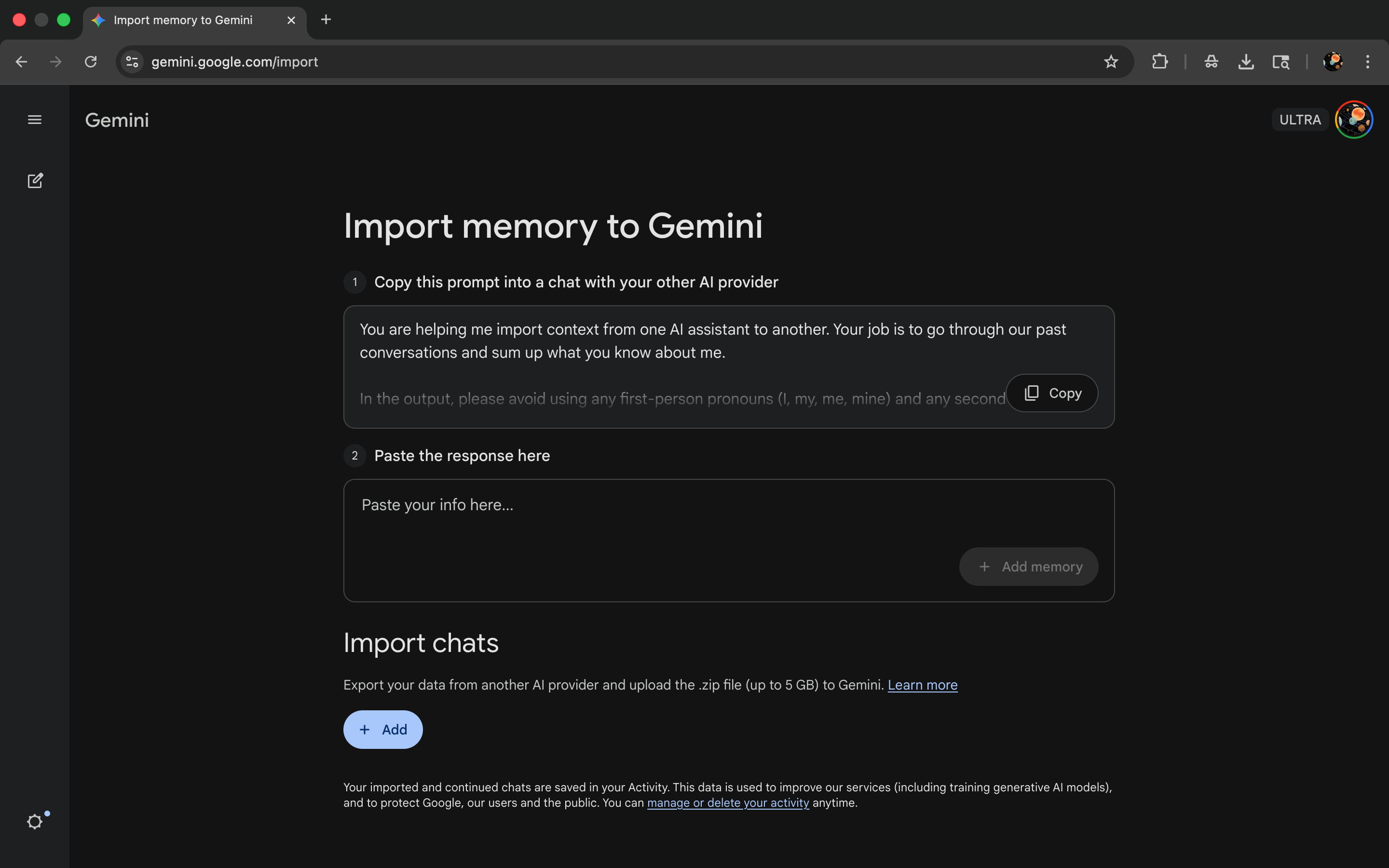 Then there’s the Import memory feature that involves entering the below prompt into another chat app and pasting the results into Gemini.