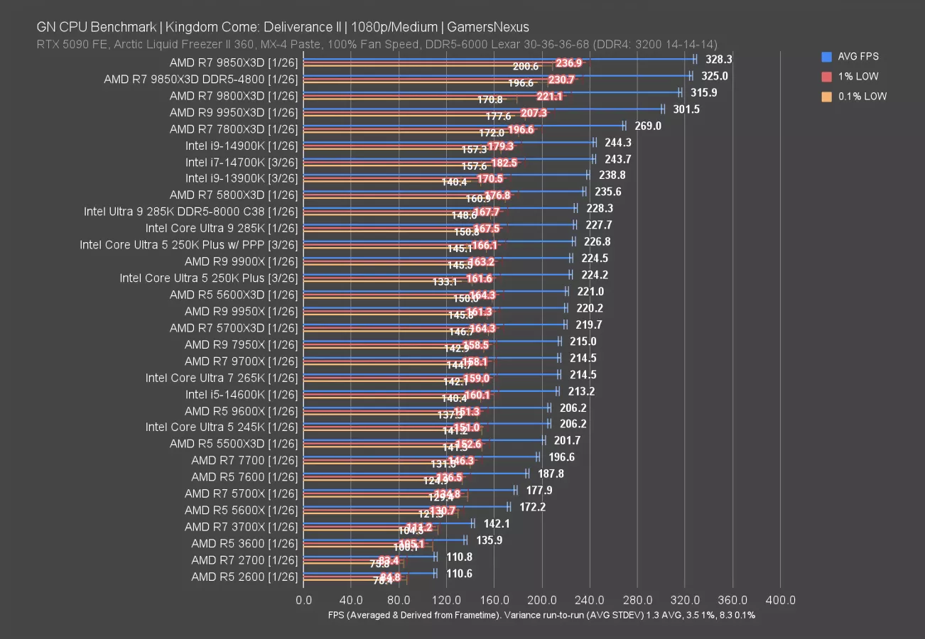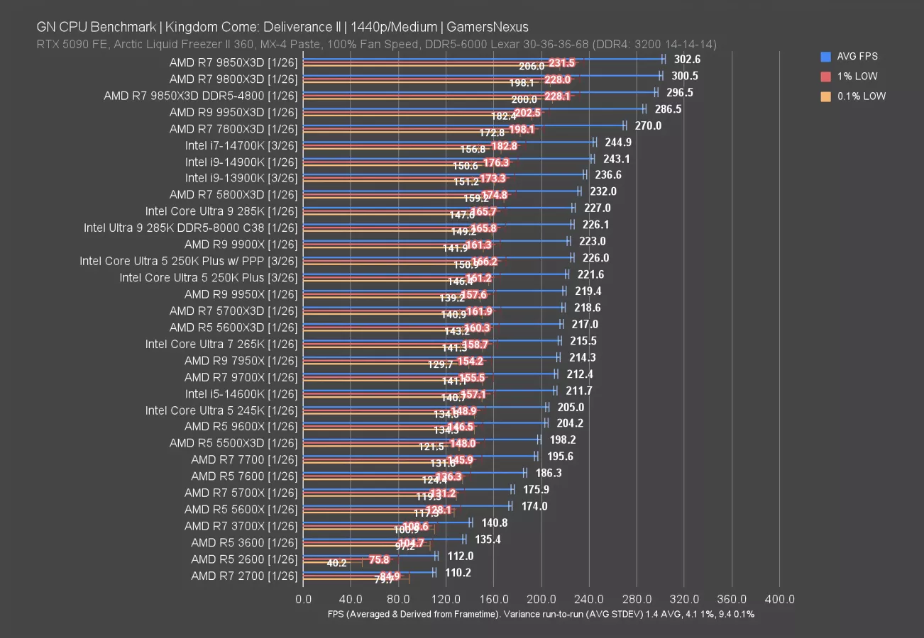 In this game, the 5600X3D and 5700X3D CPUs don’t do as disproportionately well as some other games. They’re still good, but the 250KP ends up ahead of them. As you’d expect, the 9800X3D and its refresh end up at the top of the chart but remain in a different price class.