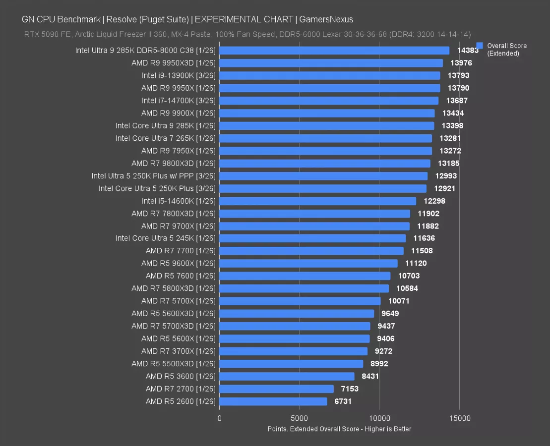 AMD’s top CPUs here are all functionally the same in performance, with no real advantage to the 16-core parts versus some of its better 8-core parts. We don’t have the 14900K retested in this one anytime recently and were too busy benchmarking Crimson Desert to go back for it, but we do have the 14700K. The 14700K has about the same overall score as the 250KP and R5 7600 in this test, which matches the results we had in this test a little over a year ago in terms of relative scaling.