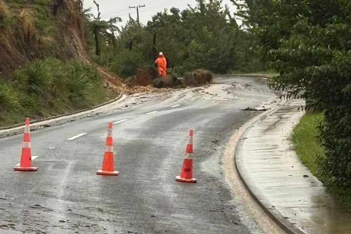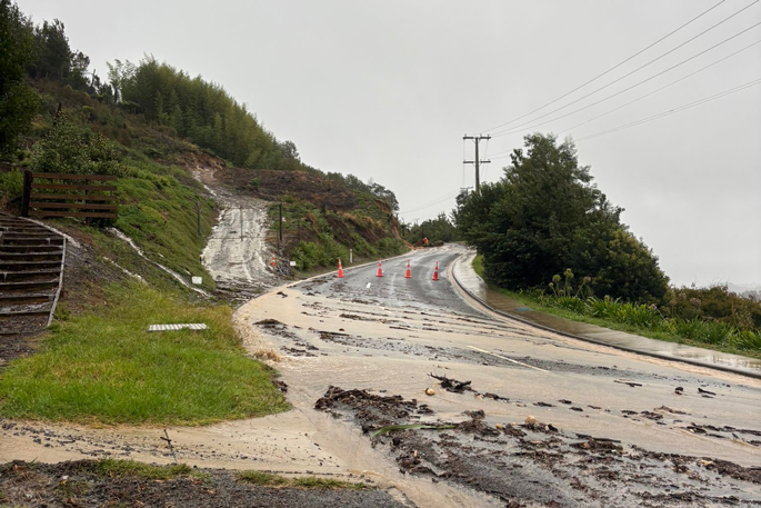 Harbour View Rd in Waihi Beach– closed between 17-19 HV Rd slip across the road. Roading crew is going out there to manage the slip material across the road.