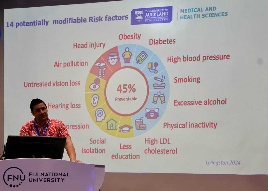Etuini presenting dementia prevention research findings in Suva, Fiji, 2025. “If we can catch people early in the dementia process, there are things that can be put in place. Things like cognitive stimulation therapy and anti-dementia medications that won’t stop or reverse the progression of dementia, but can slow the rate of decline.” (Photo supplied)
