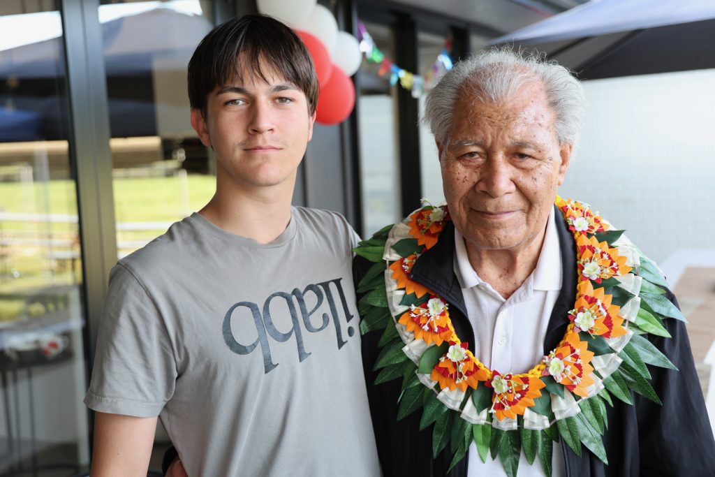 Etuini’s son, Lisiate, and father, Paula, at Paula’s 90th birthday, November 2025.