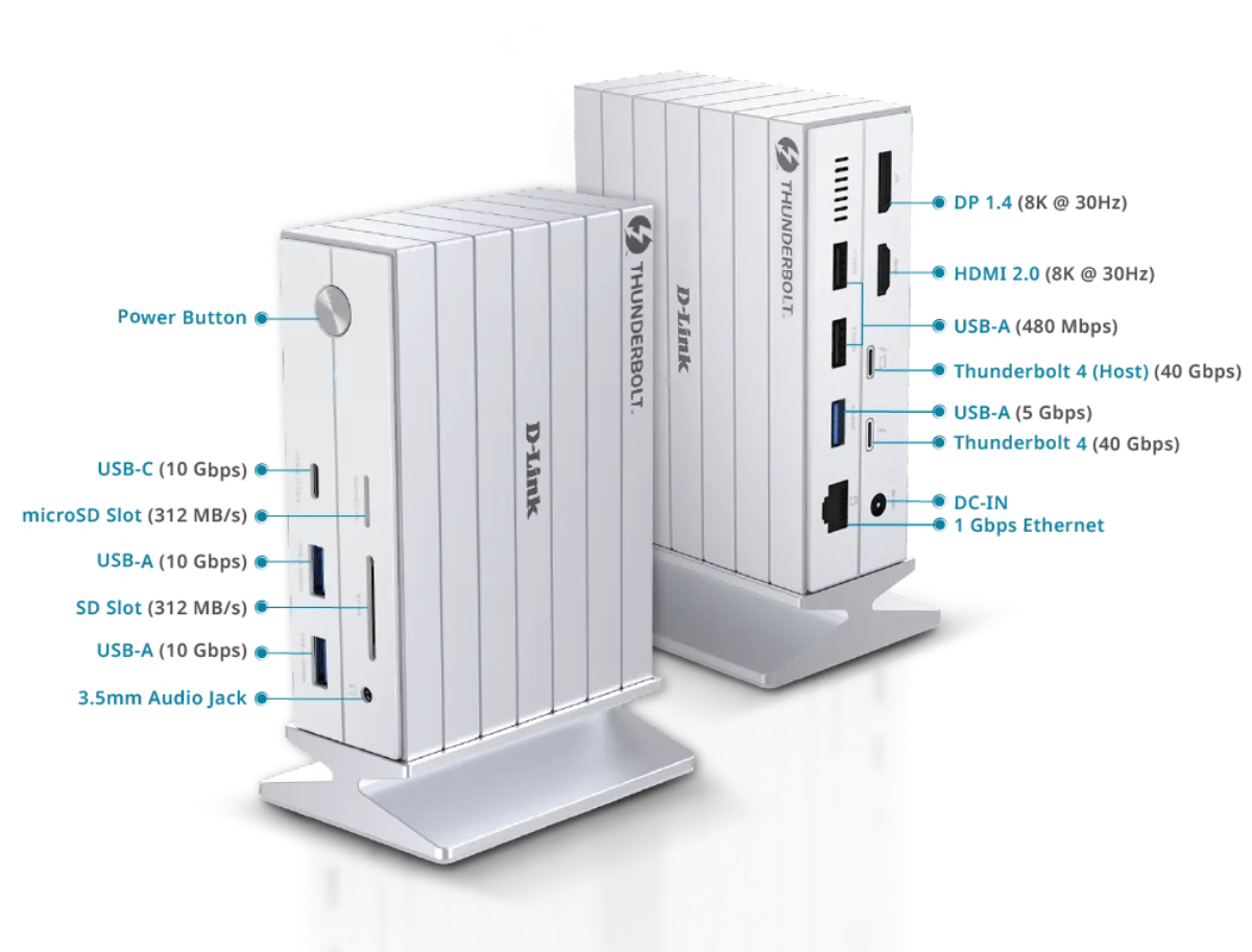 The dock also includes a Gigabit Ethernet port for wired network access, plus SD 4.0 and microSD 4.0 card slots that support cards up to 2TB. According to D-Link, the card readers offer transfer speeds of up to 985MB/s, which may appeal to photographers and videographers moving large files from removable media.