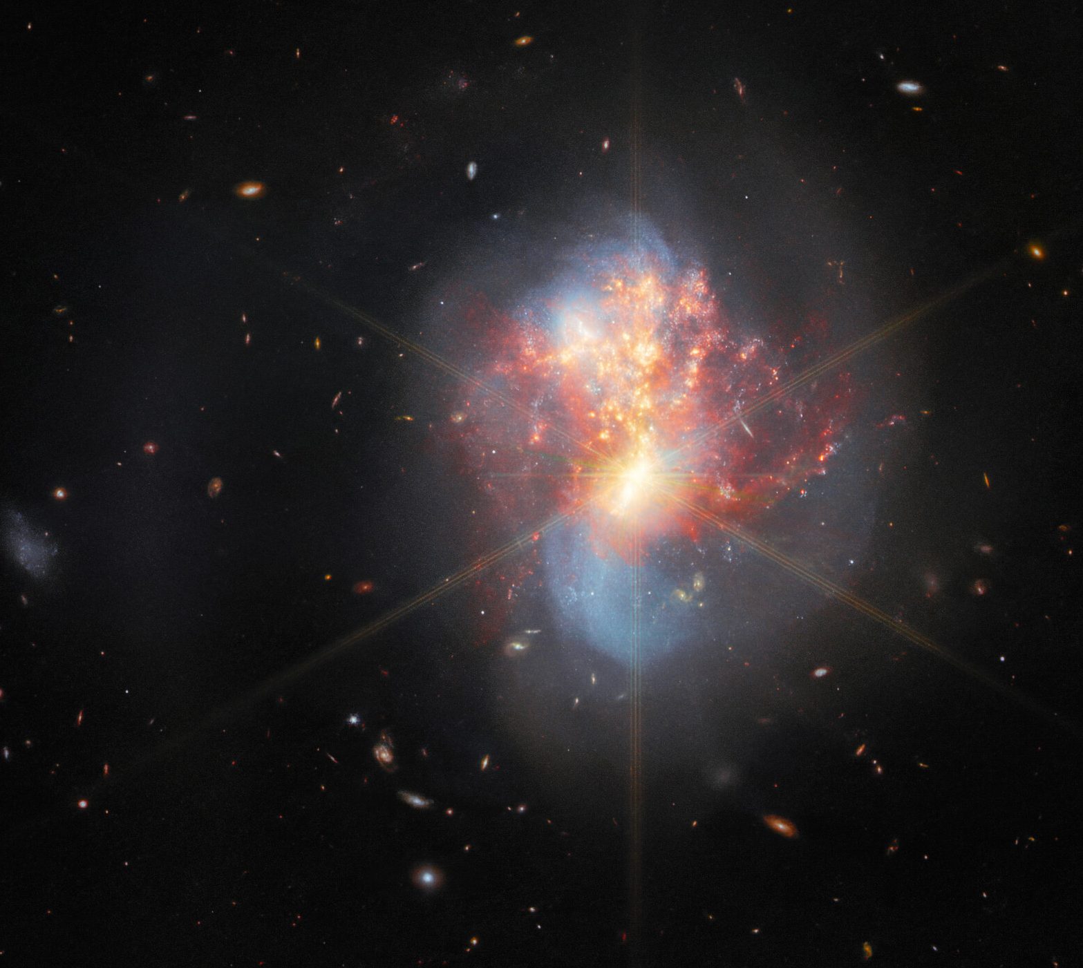 The pair of interacting galaxies in the process of a merger, known as IC 1623, is imaged here by JWST. Data from a trio of JWST’s instruments, MIRI, NIRSpec, and NIRCam, were used in the construction of this image. The ongoing starburst at the center produces intense infrared emissions. In galaxies in the early Universe, the entire galaxy itself can undergo a starburst, where stars form all at once over the entirety of a galaxy, albeit only for a brief period of time.