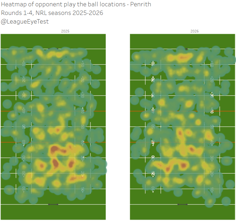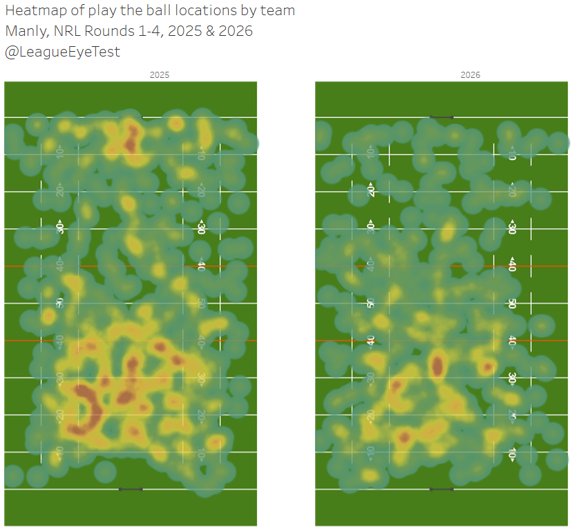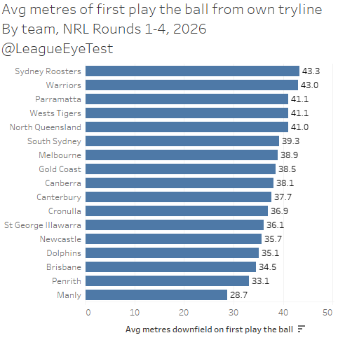 Manly have averaged just 135 play the balls per game in 2026, down from 158 over the same four rounds last season. Their opponents are controlling all of the ball, at 166 play the balls which is up from 150 per match in 2025 and the most by Sea Eagles opponents since 2014 when I started doing this.
