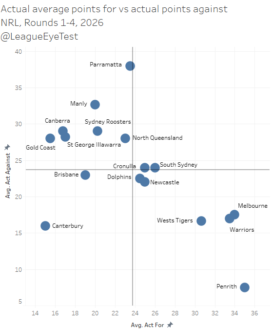 Again, you can see how Penrith are in a league of their own, with the Tigers, Storm, Bulldogs and Warriors also having a strong defensive start to the season. Cronulla are about league average here, as they were on the previous chart. They’re 2-2, with a +4 points difference, it’s hard to be more average than that.