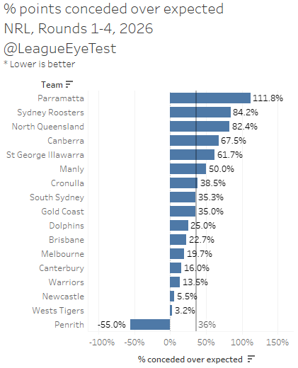 Penrith have conceded just 30 points after four games.  At just 7.5 per game, they’ve allowed less than half of the next best defensive team (Canterbury at 16 per contest). They averaged 29.5 against for their first four games last season (118 points), and gave up 28, 38 and 30 points in their losses from Round 2 to 4 in 2025.