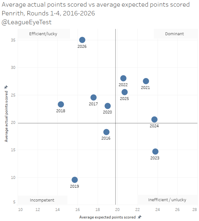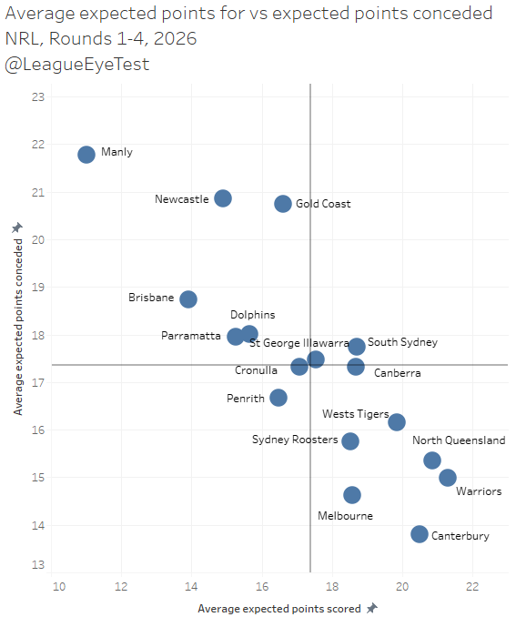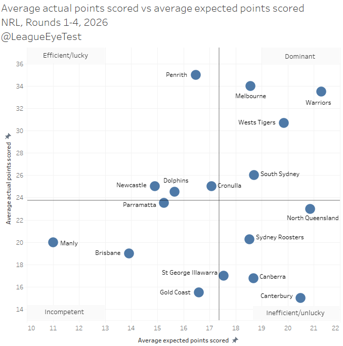 The surprising thing for me here is seeing Penrith in the “Efficient/Lucky” quadrant, as they’ve been a staple of the “Dominant” one since 2020. Granted they are nearing the boundaries of that quadrant, but this is why they’re a little more dangerous than prior seasons when they would score off a build up of attack.