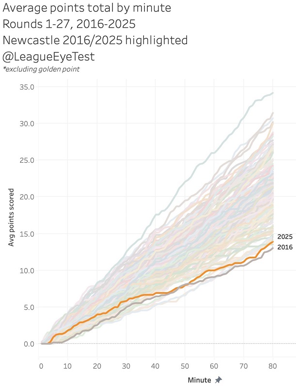 One of my favourite charts last season was showing how dire the Knights were in attack. Despite playing in one of the most attacking friendly eras of the NRL, they were averaging a similar level of points to the 2016 Nathan Brown era Knights. Here’s the chart in question for reference.