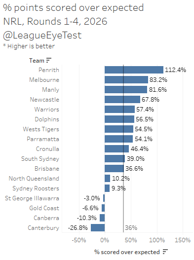 Nothing unusual here, just Penrith allowing -55% fewer points than expected, against a league that is +36% as a whole and there’s no other team in the negatives. Perfectly normal stuff. Newcastle and the Wests Tigers look to be the next best defensive teams, but based on history from both sides I’d want to see a much larger body of work from both before being comfortable with their performances.