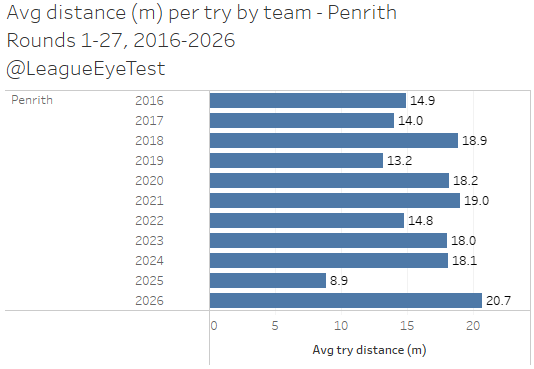 This year their average try distance from those seven crosses is just 15.4 metres, second lowest in the NRL