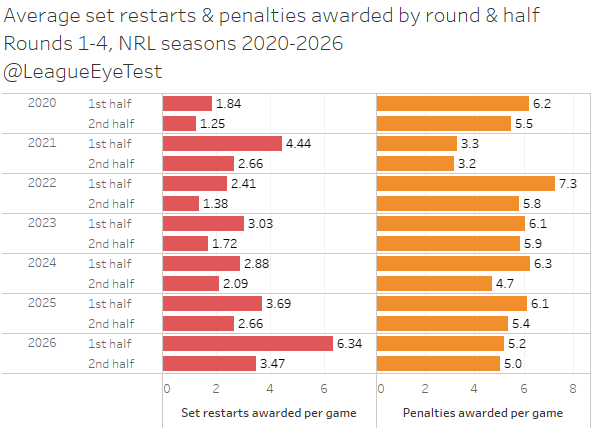 I decided to have a look at the half breakdowns, and this year we have 6.3 set restarts being called in the first half (the same average for a whole game in 2025), and just 3.5 in the second half. Meanwhile average penalties are 5.2 in the first half and 5.0 in the second half.