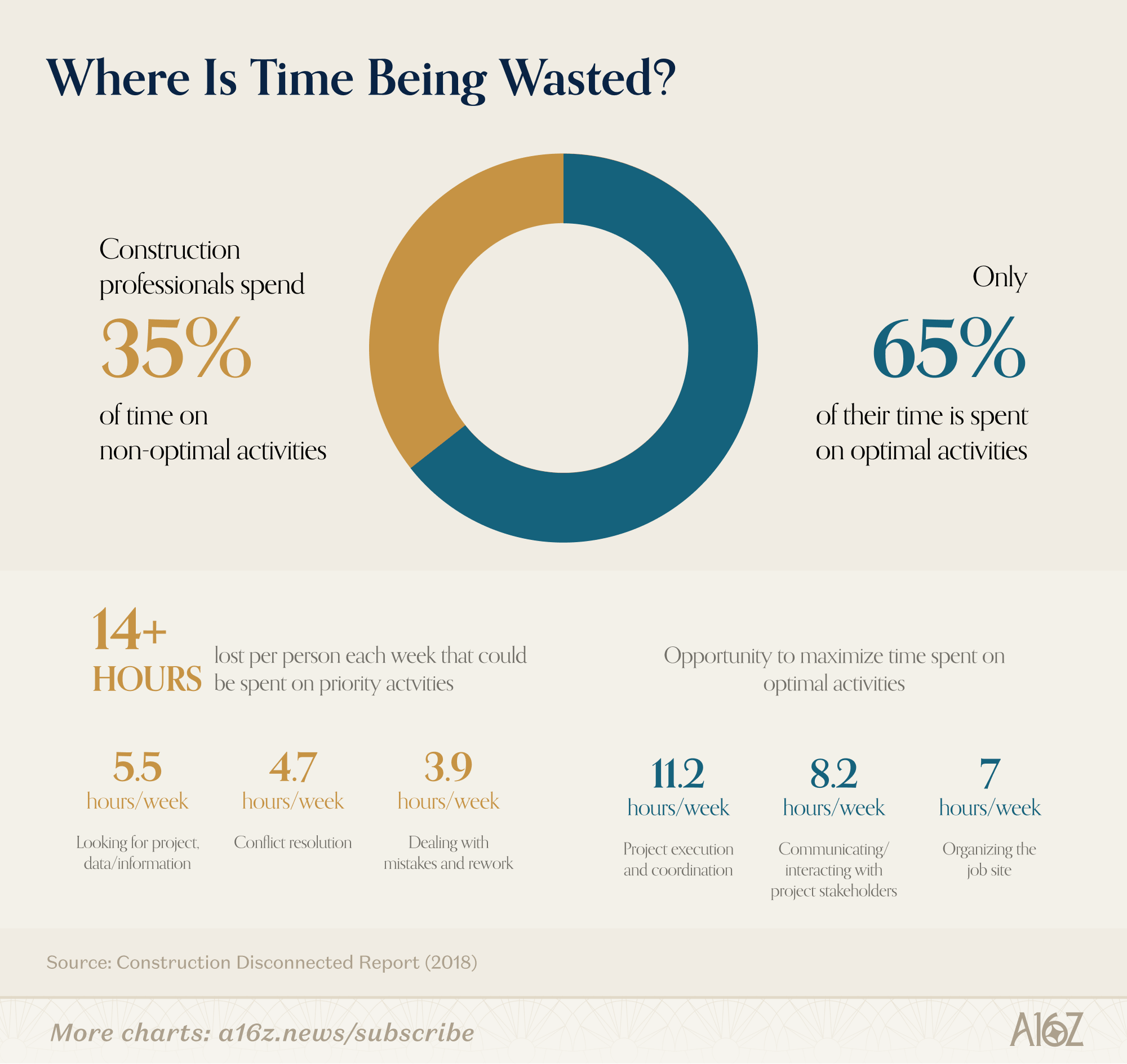 Inside each firm, the tools are a mess. Most of the software these firms run on was built in the late 1990s — desktop applications, installed locally, not connected or hardly connected to the cloud. They require enormous amounts of manual labor just to operate. An engineer doesn’t spend most of their day doing engineering. According to research by Autodesk and FMI, construction professionals spend 35% of their time, or over 14 hours a week, on non-productive activities like looking for project information, resolving conflicts, and dealing with mistakes and rework. Much of that is just keeping disconnected tools in sync with the actual state of the project.