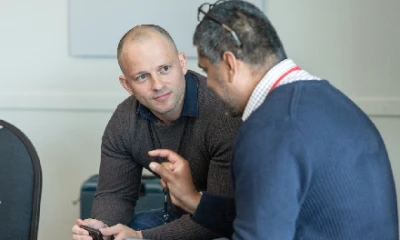 Brendan O’Connell of AgriTech NZ discusses the proposal with Professor Angus McIntosh of the University of Canterbury. Photo credit: Mel Waite Photography