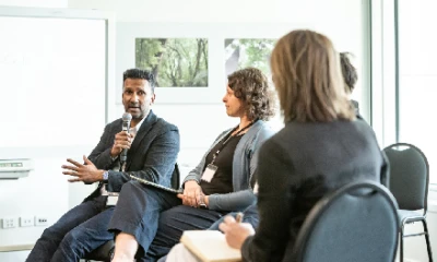 Muneesh Mundaliar, GM Automation and Operational Technology Fonterra, and Kiri Wallace, Eco-Index and University of Waikato, taking part in panel discussions led by Nicola Peddie, Strategic Partnerships Research Advisor at University or Canterbury. Photo credit: Mel Waite Photography