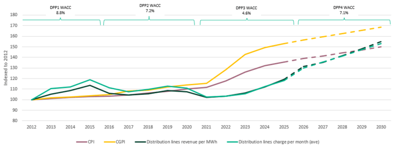 Source: Electricity Networks Aotearoa analysis, based on Commerce Commission published ID data to 2025, Stats NZ CPI and CGPI, and forecast data from the DPP4 modelling suite and asset management plans