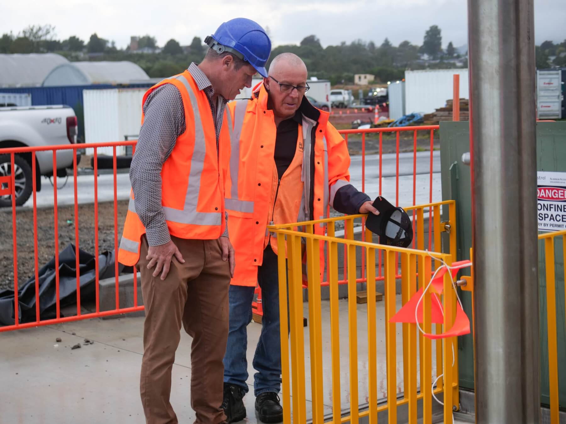 Mayor Mike and Martin Mould watching the first waste water enter the new system