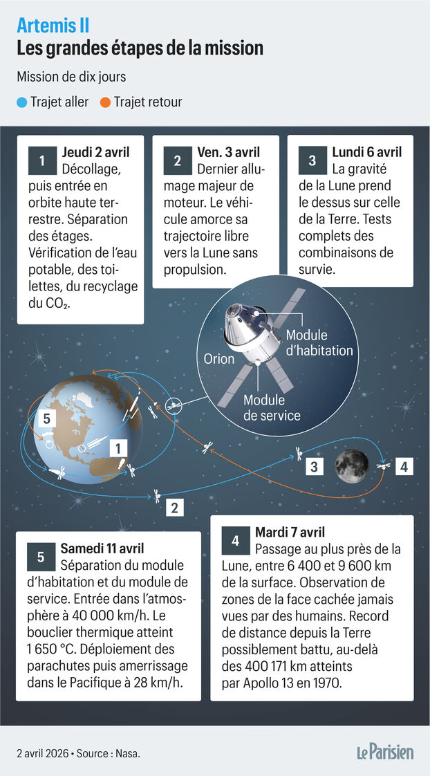 Le grand public s’y était habitué dans les années 1960 et 70 mais, plus aucun humain n’ayant quitté l’orbite terrestre depuis les missions Apollo, cette manœuvre, que vont réaliser les 4 astronautes de la mission Artémis II la nuit prochaine, à 1h44, heure de Paris, est extrêmement attendue. Après deux orbites complètes autour de la Terre, la capsule Orion doit réaliser une poussée moteur d’environ 6 minutes – d’où son surnom de « Big burn » – pour gagner suffisamment de vitesse, quitter l’orbite terrestre basse et filer vers la Lune.