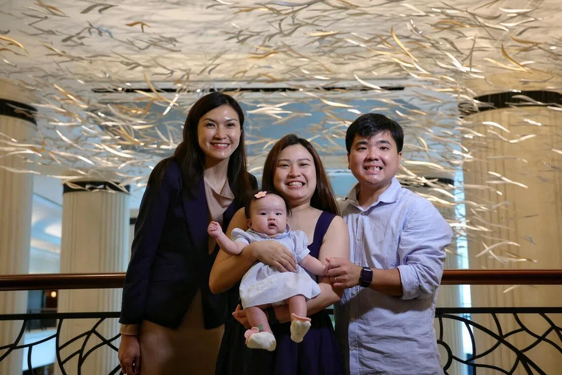 Adjunct Associate Professor Chin Hui-Lin (left), a geneticist with NUH, with patient Ng Zhuang Shu (centre), her husband Luis Teo and their five-month-old daughter Ellie Teo at the biennial Scientific and Innovation Summit at Shangri-La Hotel on April 2.