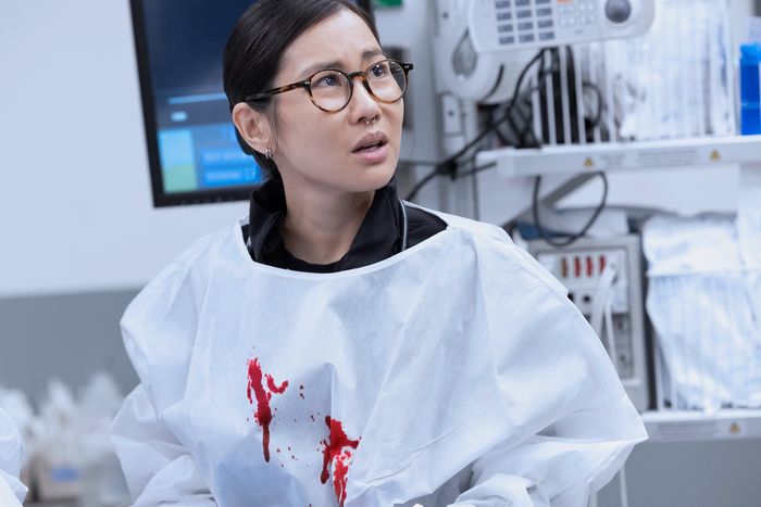 It’s not the first time this season that newcomer Joy has set boundaries for herself rather than succumb to the teacher’s-pet temptations of fellow student James Ogilvie (Lucas Iverson). On a team full of go-getters eager to get their hands as dirty as possible, Joy stands out for her unbothered, verging on bored attitude. In Choi’s words, “She wears her IDGAF card like a name tag.” It’s possible Joy’s passivity comes from a genuine lack of passion for the ER; this is her first rotation, and she admits that losing her grandmother to leukemia made her realize she “doesn’t want to be around people dying.” But Choi also looked to Joy’s background as a daughter of immigrants — an experience she shares — to understand her intensely internal character. “Burnout happens a lot with daughters of immigrant families,” Choi says. “Mohan and Joy both have these obligations to their families whom they’ve had to help navigate the system here. A lot of the well-being of the parents is put upon the daughter in medical school, and there’s pressure that comes with that.”
