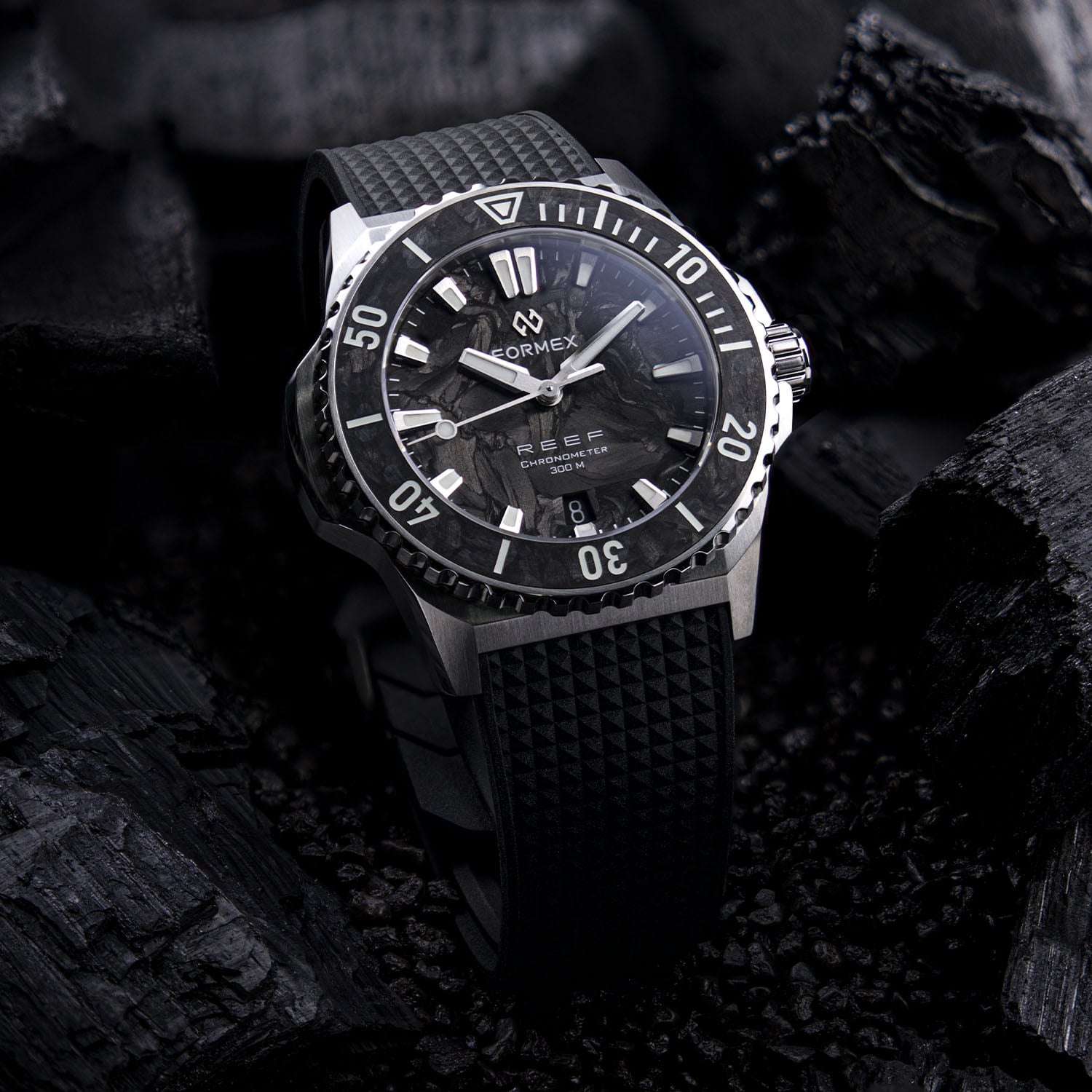The new Reef 39.5 Forged Carbon builds on this foundation but introduces a different aesthetic. While carbon is often used for weight reduction or performance claims, Formex focuses on its visual and tactile qualities. The dial and bezel are executed in forged carbon, a material created by compressing short fibres under heat and pressure. Integrating this material required adaptation. The vertically brushed dial sits on a treated base; the signature bevelled date window at 6 o’clock is preserved with precise layering. On the fully functional, 120-click dive bezel, numerals are engraved using a femtosecond laser and filled by hand with lume.