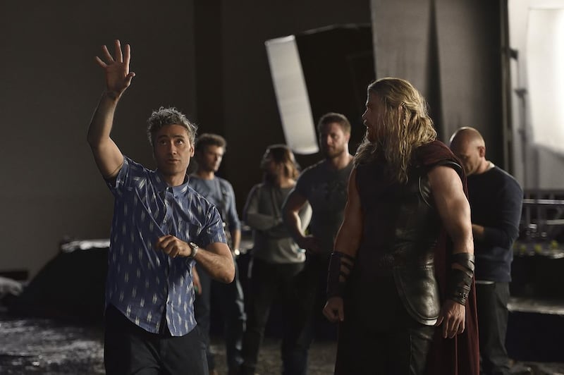 Director Taika Waititi with actor Chris Hemsworth during filming of Thor: Ragnarok. Photo / Marvel Studios