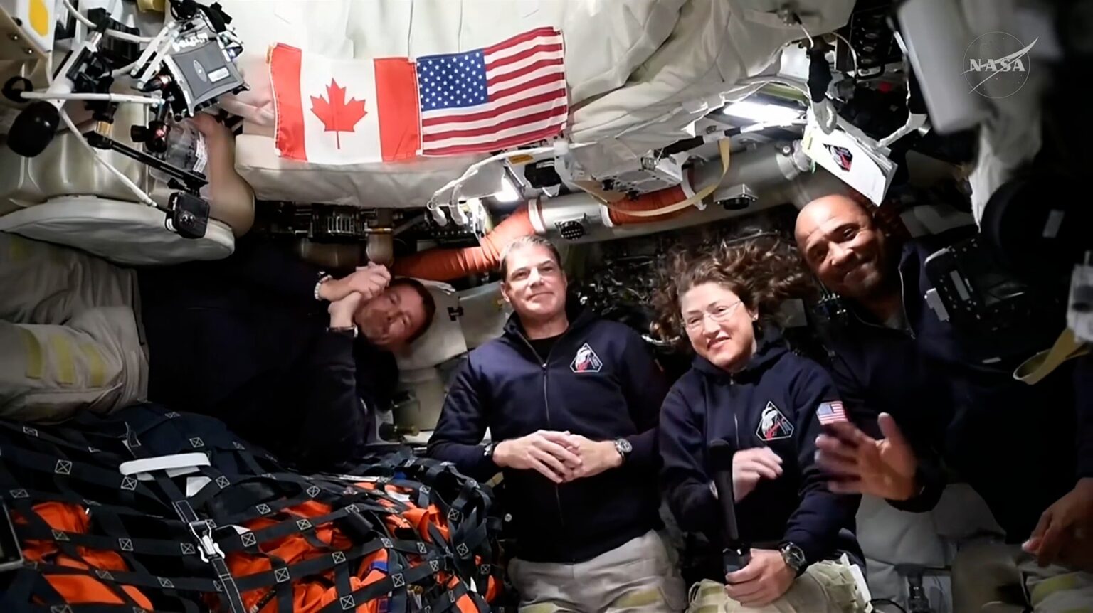 The Artemis II crew: NASA astronaut Reid Wiseman (far left), Canadian Space Agency (CSA) Jeremy Hansen (center left), and NASA astronauts Christina Koch (center right) and Victor Glover (right) participated in a live media event aboard the Orion spacecraft on the fourth day of the mission. Photo: NASA