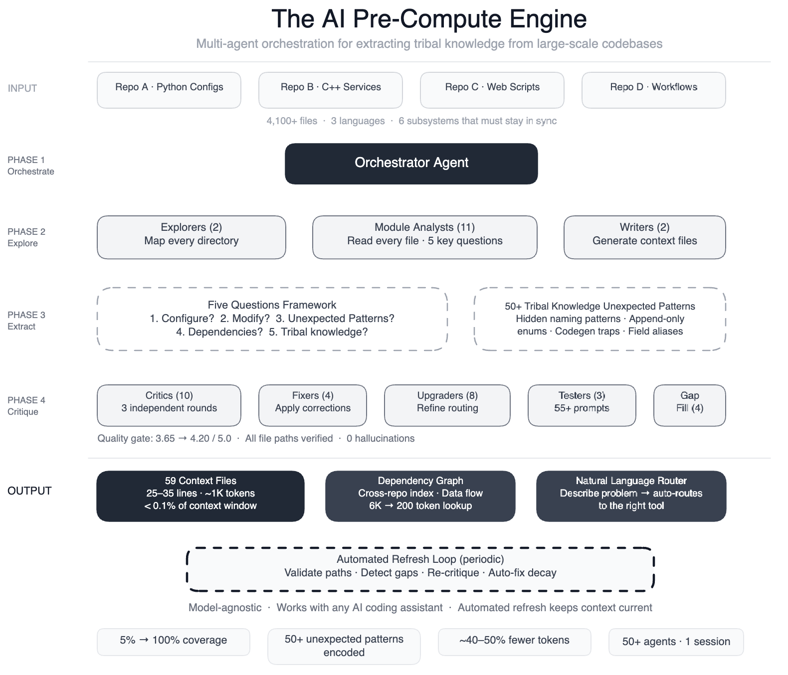 We fixed this by building a pre-compute engine: a swarm of 50+ specialized AI agents that systematically read every file and produced 59 concise context files encoding tribal knowledge that previously lived only in engineers’ heads. The result: AI agents now have structured navigation guides for 100% of our code modules (up from 5%, covering all 4,100+ files across three repositories). We also documented 50+ “non-obvious patterns,” or underlying design choices and relationships not immediately apparent from the code, and preliminary tests show 40% fewer AI agent tool calls per task. The system works with most leading models because the knowledge layer is model-agnostic.