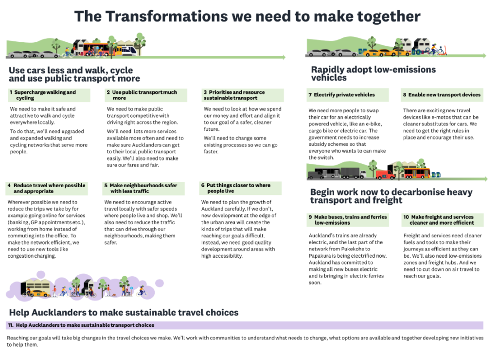 Supercharge walking and cyclingMassively increase public transport patronagePrioritise and resource sustainable transportReduce travel where possible and appropriateSafe, low-traffic neighbourhoods for peopleBuild up, not outElectrify private vehiclesEnable new transport devicesLow-emissions public transportEfficient freight and servicesEmpower Aucklanders to make sustainable transport choices