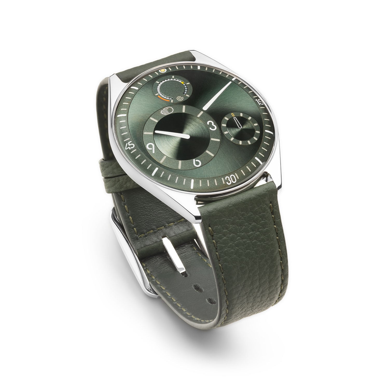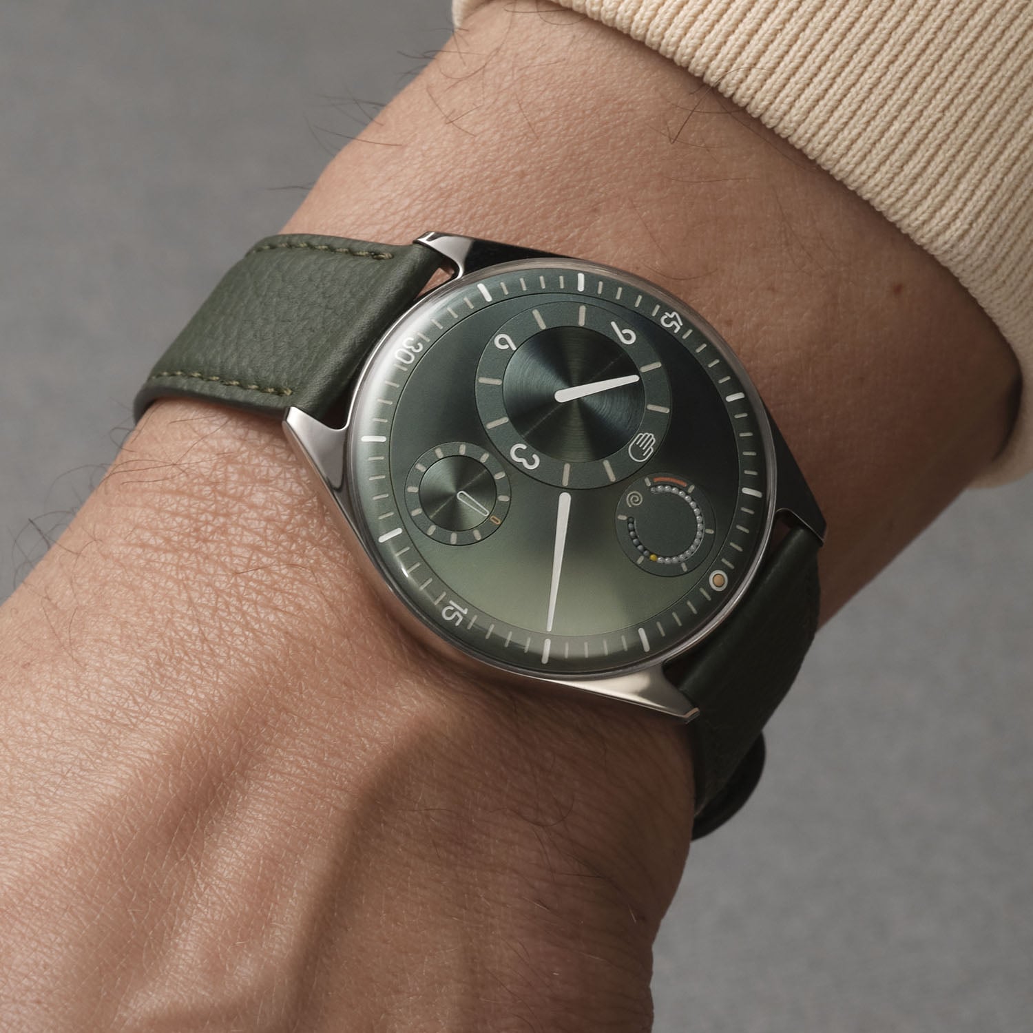 Available in three colours – Pine, Sky, and Latte – the dials feature a sunburst finish in the centre, a circular finish inside the hour and second sub-dials, and a grained finish on the outer minutes track, the power reserve indicator, and the rings of the hour and second counters.