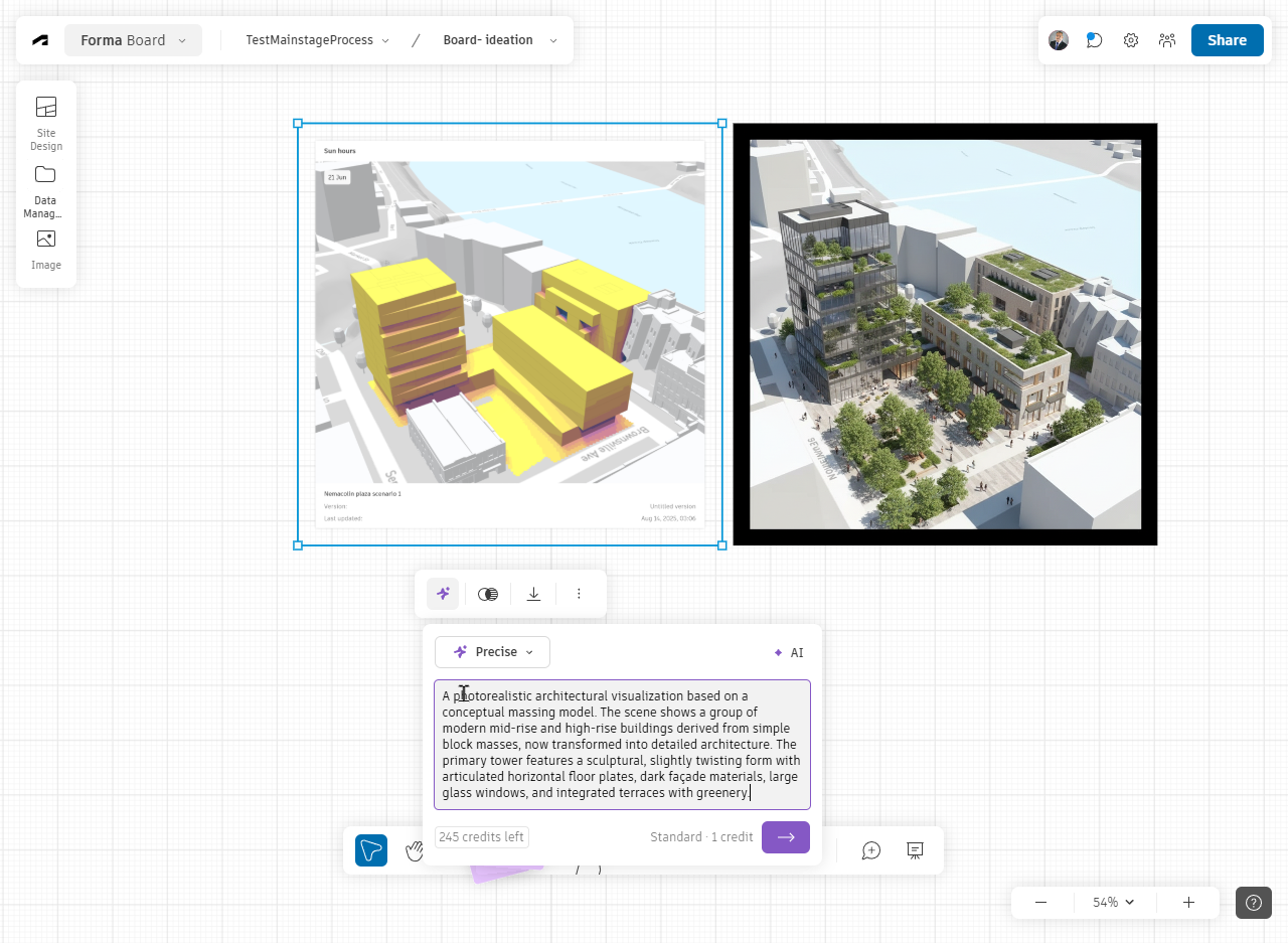 Coming soon, AI rendering capabilities in Forma Board enable teams to visualize intent from sketches and images and more easily explore atmosphere, materiality, and mood.