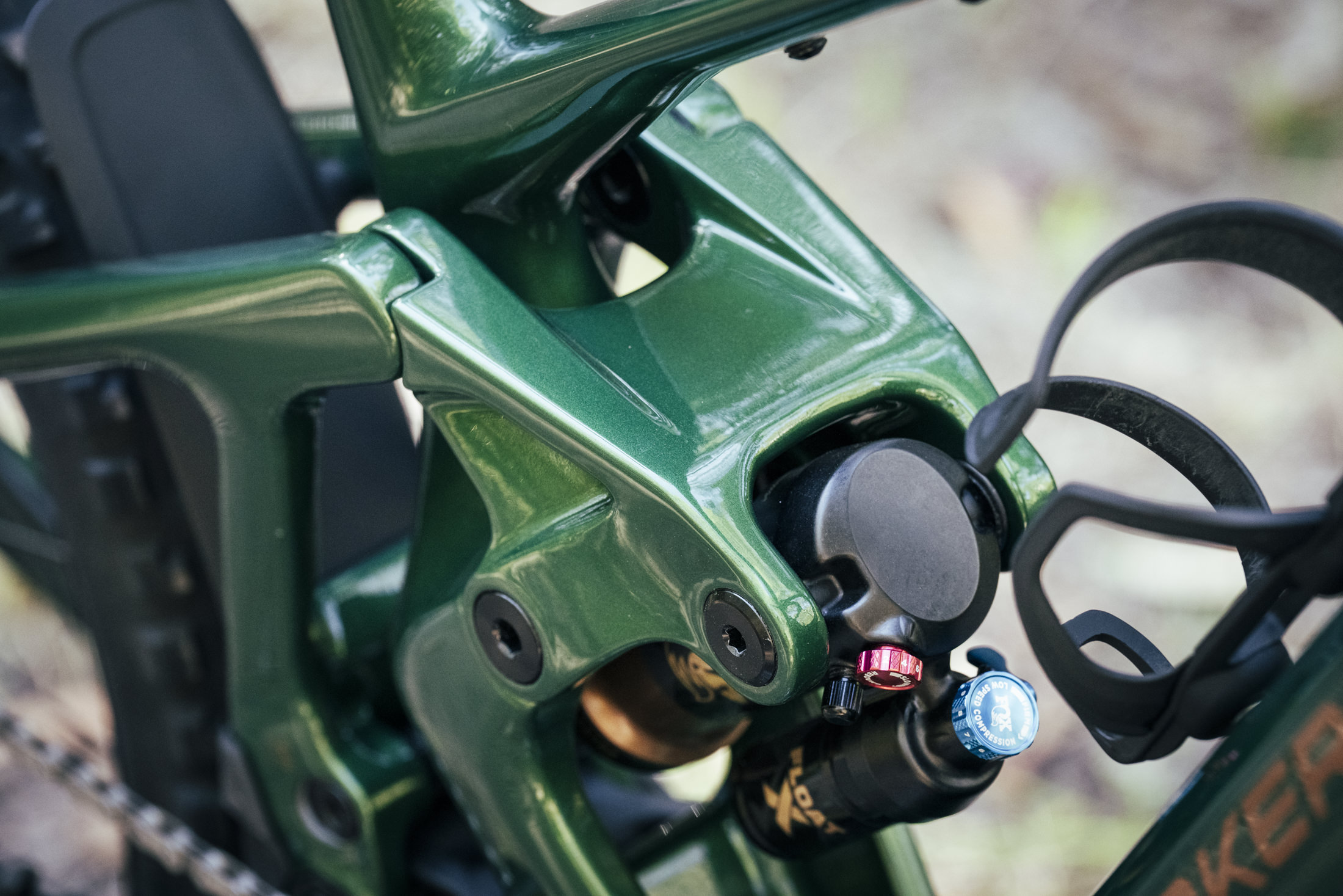 A one-piece carbon rocker the size of a small watermelon, twin-sealed bearings, moulded internal cable channels, an integrated display, neat frame protection, a rear shock mudguard and a new chainstay silencer all point to a bike that has had a fair bit of attention paid to the finer points. The downtube is impressively skinny too, especially next to the chunkier shapes we’re used to seeing on removable-battery e-MTBs.