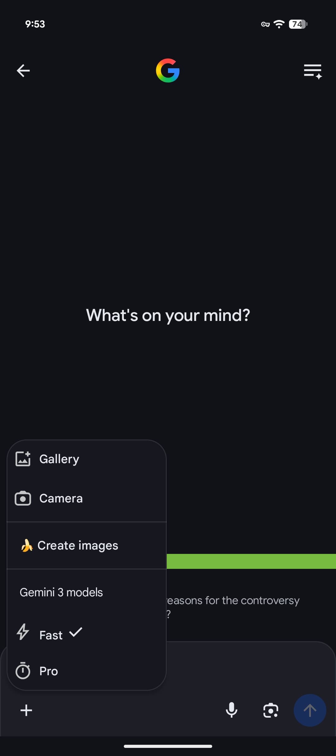 There are very large buttons for Gallery and Camera. “Tools” is the next section, with “Create images” being the only one available on mobile. The “Gemini 3 models” switcher is last with Auto or Pro.