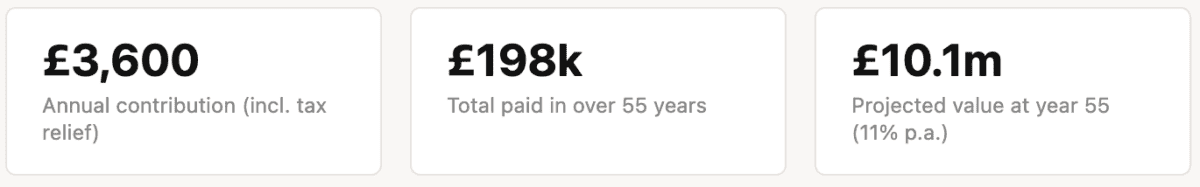 The mechanics are simple but powerful. Parents and grandparents can pay up to £2,880 per year into a child’s SIPP — and even though the child pays no tax, the government adds 20% relief, bringing the total annual contribution to £3,600. That’s it. That’s the whole strategy.