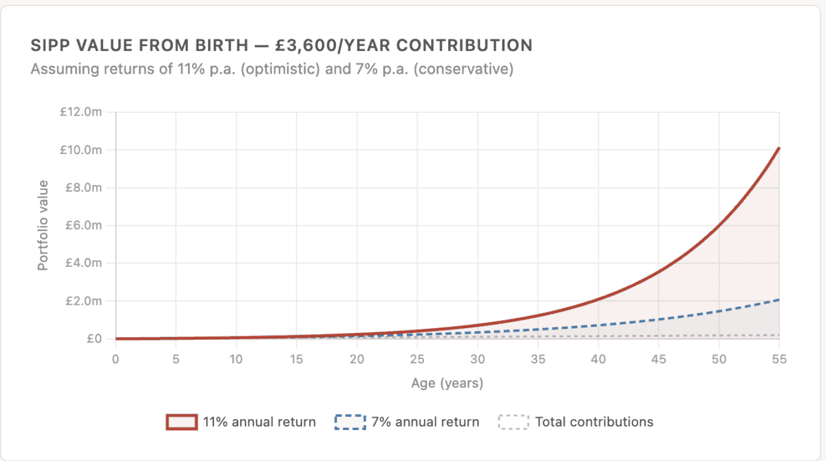 Assuming the money is invested in global stocks returning 11% annually — broadly in line with the S&P 500‘s performance over the past 55 years — those modest contributions compound into something remarkable. After 20 years the pot sits at around £230,000. After 35 years, £1.2m. By year 55, just over £10m.