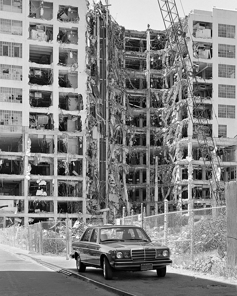 Mimi Plumb (American, born 1953), Building and Mercedes, 1987, gelatin silver print, courtesy of the artist. © Mimi Plumb.