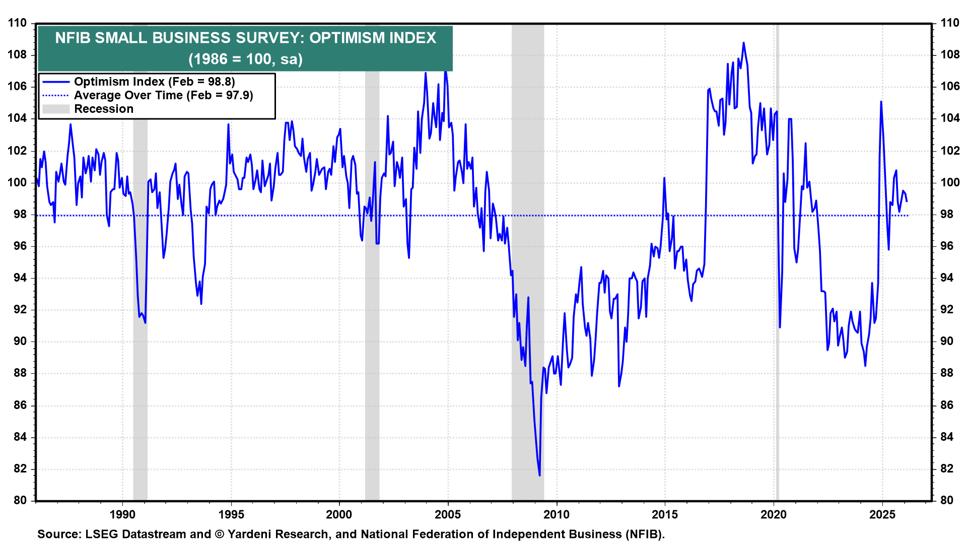 The March NFIB Small Business survey (Tue) will offer insights on how small businesses are responding to the war. The NFIB Optimism Index stood at 98.8 in February, just above its long-run average of 97.9 (chart). It dropped sharply during the energy shock in 2022. It is likely to do so again.