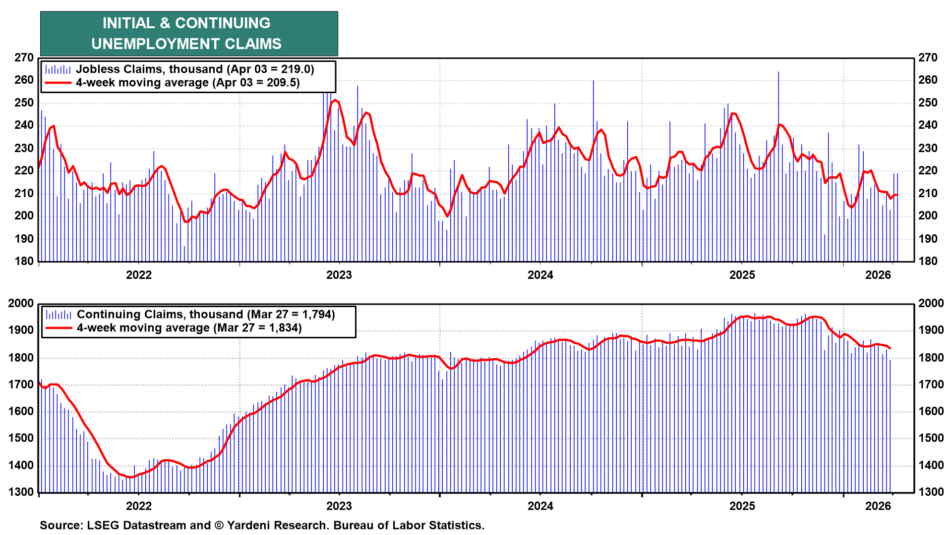 (2) Unemployment. Initial jobless claims (Thu) ticked up to 219,000 for the week of April 3, with the four-week moving average rising to 209,500, its first uptick in several weeks (chart). Continuing claims fell to 1,794,000, with the trajectory suggesting that the duration of unemployment may be shortening (chart). This week’s data are likely to confirm that the labor market remains resilient; the energy shock has yet to hit it.